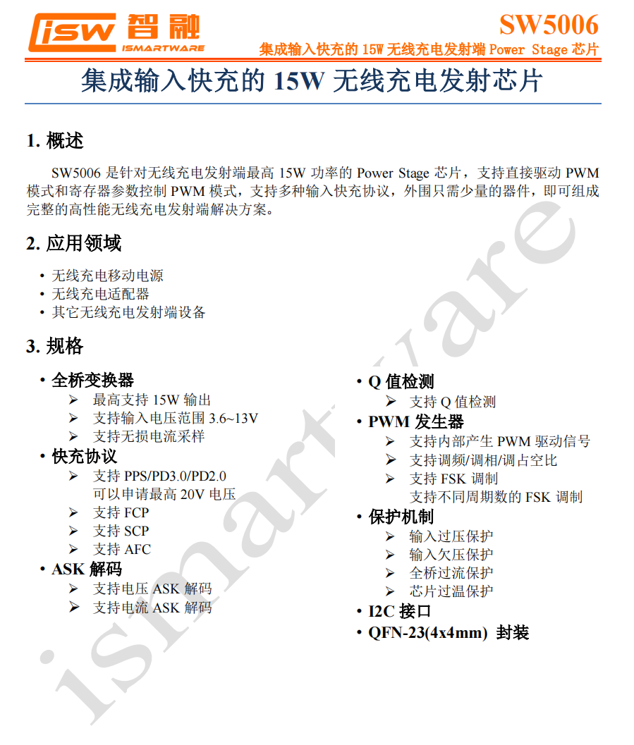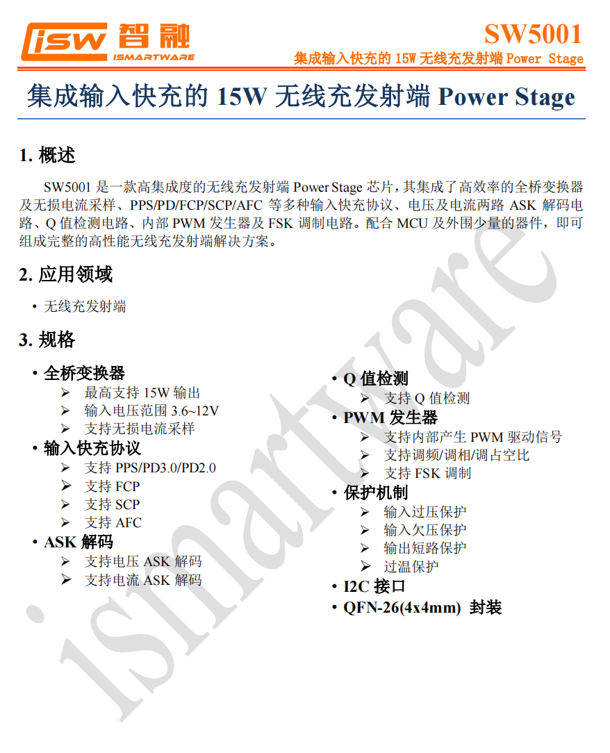 智融SW5001智融SW5001是一颗高度集成的无线充发射端集成功率级芯片。芯片内部集成了高效率的全桥变换器和无损电流采样,支持PPS/PD/FCP/SCP/AFC等多种快充协议。集成电压和电流ASK解码电路、Q值检测电路,内部PWM发生器和FSK调制电路,适用于无线充发射端应用,支持最高12V输入,耐压16V,支持15W输出功率。
