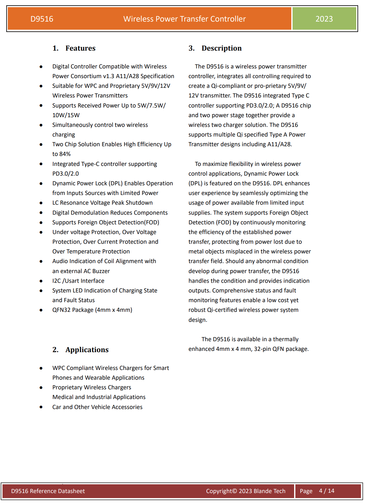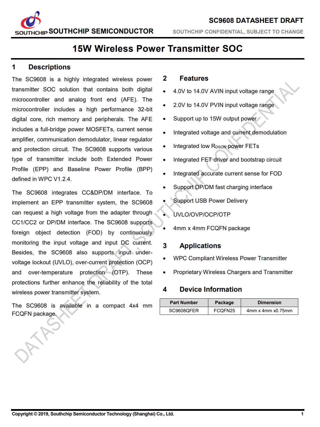 SC9608采用4mm*4mmFCQFN-25倒装封装,可获得更佳的散热性能。适用于各种兼容WPC的无线充电发射器或私有协议的无线充电发射器使用。