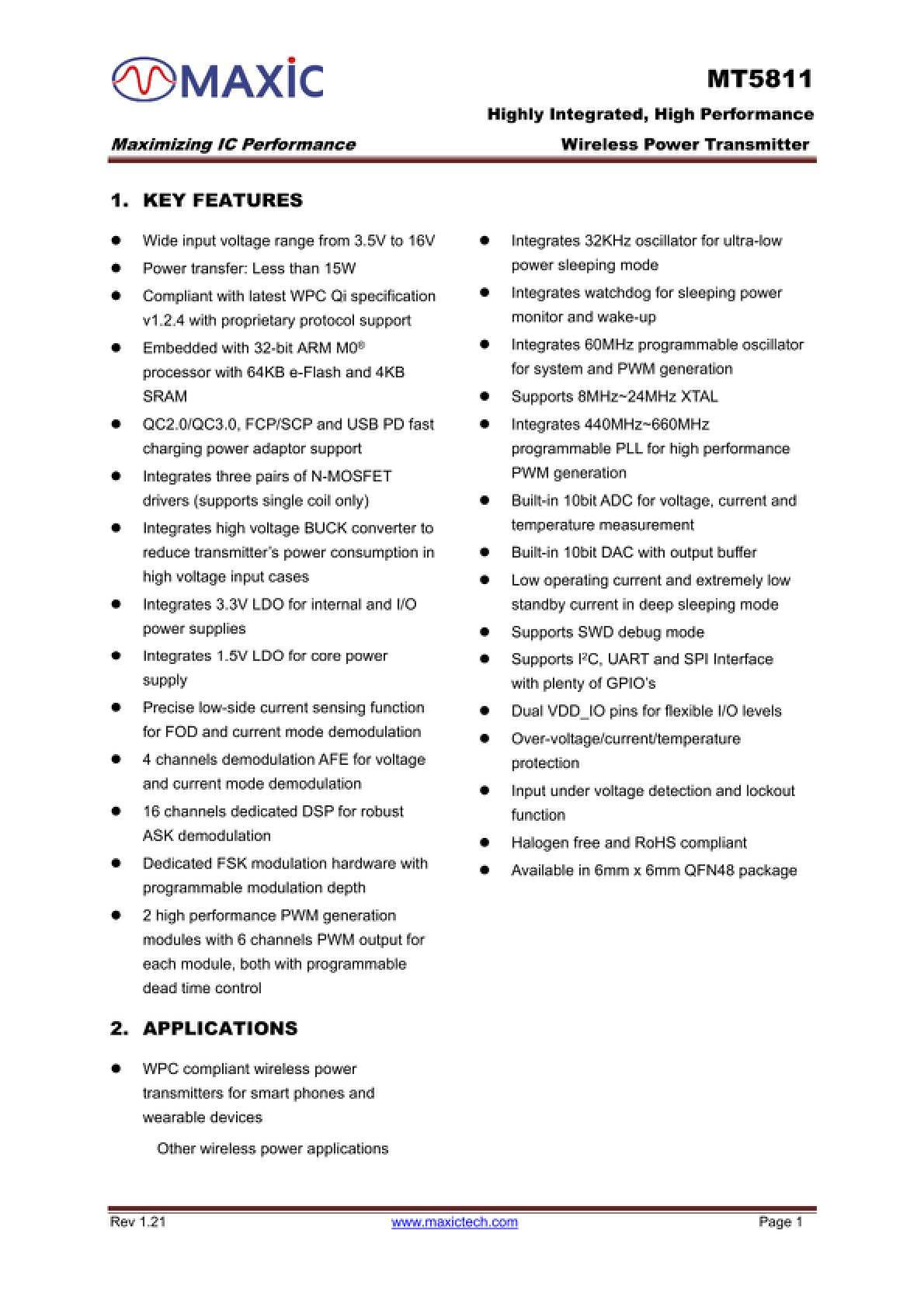 美芯晟MT5811美芯晟MT5811采用6*6mmQFN48封装,内置ARMM032位处理器,内置16KBeFLASH和4KBSRAM,支持15-50W无线充电应用。