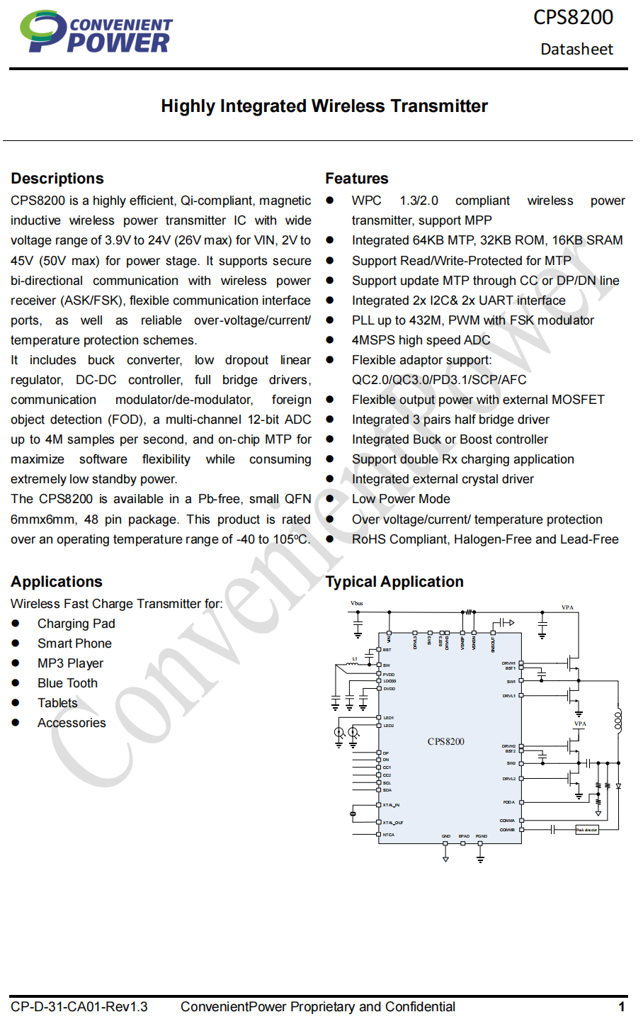 该器件包括降压变换器、低压差线性稳压器、DC-DC控制器、全桥驱动器、通信调制器/解调器、异物检测(FOD)、多通道12位ADC(每秒最高可达4M样本),以及片上MTP,以最大程度提高软件灵活性,同时在待机状态下消耗极低的功耗。CPS8200采用无铅环保设计,封装为QFN486mmx6mm。