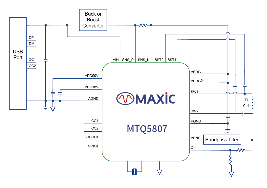 美芯晟MTQ5807MTQ5807是一款适用于汽车应用,最高支持15W的无线充电发射端芯片。它符合最新的WPCQi规范并支持(认证)和UFCS等多种私有快充协议。在芯片设计时采用了美芯晟专利技术Q值检测技术,实现以极低的功耗、更精确地检测到异物,提高系统可靠性。