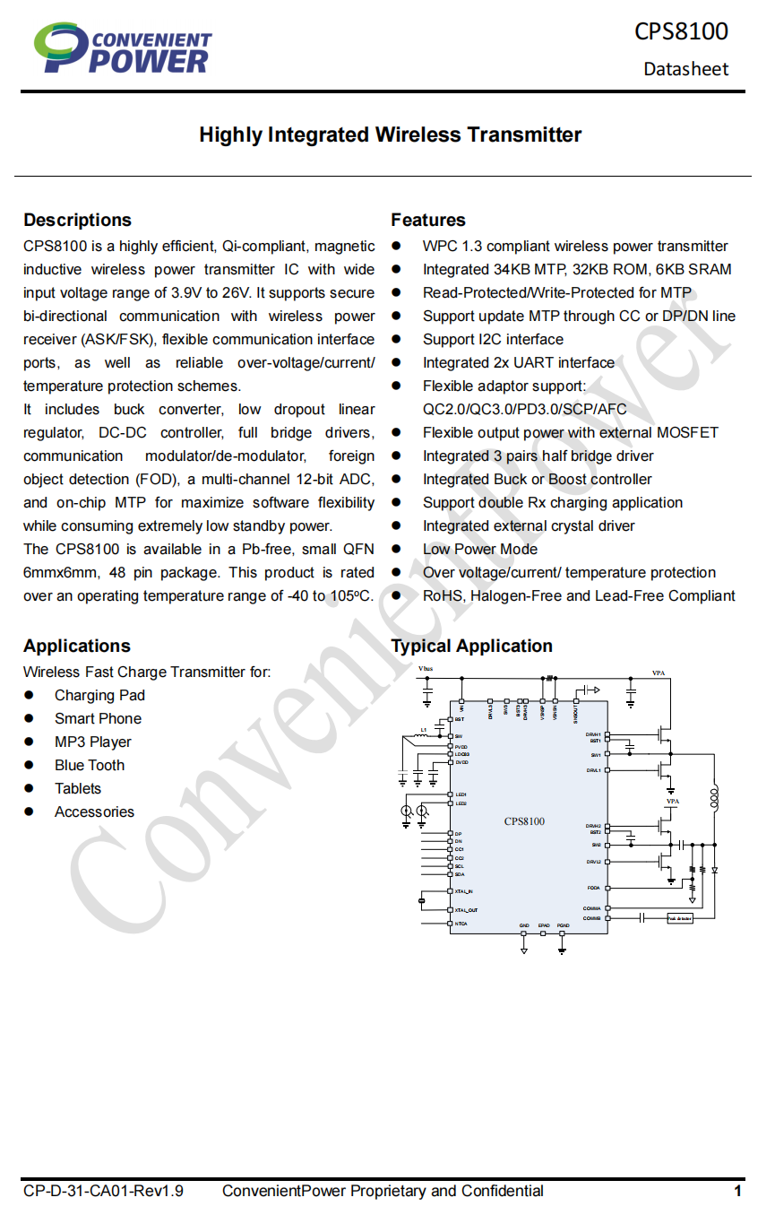 易冲CPS8100CPS8100,是一颗高效率高集成度符合Qi标准的无线充电发射芯片,具备3.9V到26V的输入电压范围,支持与无线电能接收器的安全双向通信(ASK/FSK),,具有灵活的通信接口端口,以及可靠的过压/过流/过温保护方案。