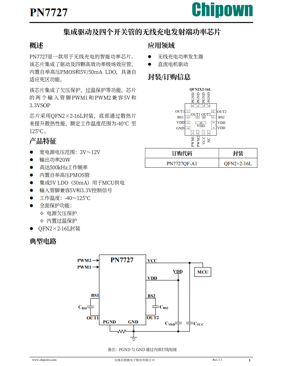 芯朋PN7727芯朋PN7727是一颗支持Qi220W无线充电的全集成智能功率级芯片,芯片内部集成驱动器和H桥MOS管,并且集成一颗5V输出电压的稳压器,用于MCU供电。芯片支持3-12V供电,工作频率高达500KHz。