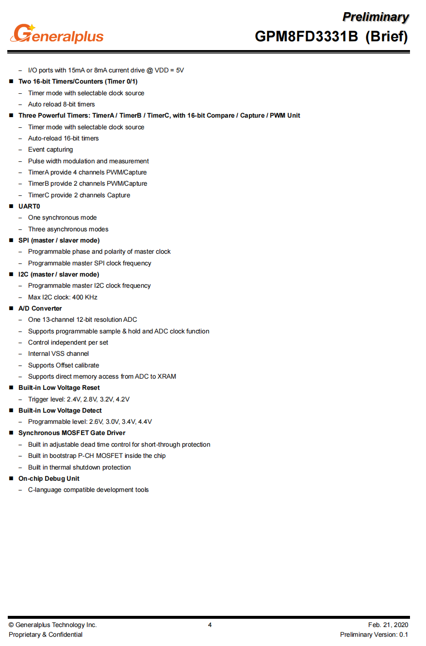 在定时器和计数器方面,GPM8F8006C芯片配备了两个16位定时器/计数器(Timer0/1),以及三个强大的定时器:TimerA、TimerB和TimerC。这些功能支持多种定时和PWM功能,为开发者提供了丰富的计时和测量选项。