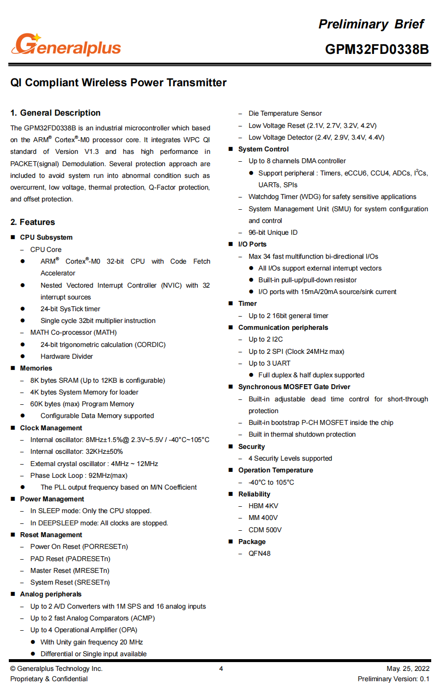 GPM32FD0338B采用QFN48封装,提供最大34个快速多功能双向I/O端口,每个I/O端口支持外部中断向量,具有15mA/20mA的源/汇流能力。