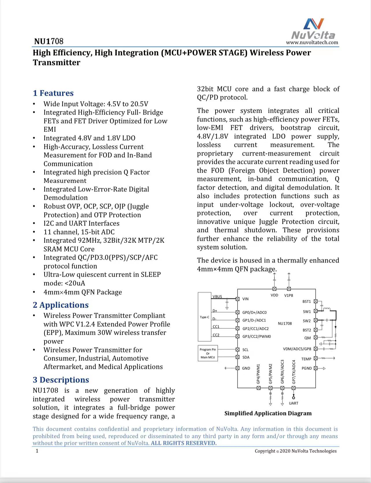 伏达NU1705ANU1705A是一款新一代高度集成的无线电力发射器解决方案,集成了为宽频率范围设计的全桥功率级、32位MCU核心和QC/PD协议的快速充电模块。