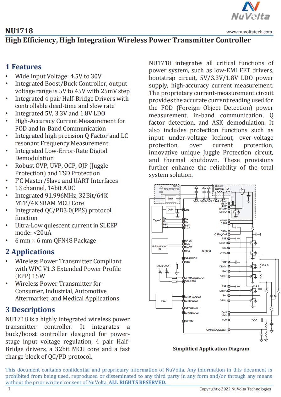 伏达NU1718NU1718是一款伏达自主开发的高集成度无线充发射端控制器芯片,集成了一个用于电源输入电压调节的Boost变换器,可调节输出电压范围为5V至45V,步进为25mV,集成四对半桥驱动器,可控制死区时间和斜率,集成了一个91.996MHz时钟频率、32位架构、64K多编程存储器和4K静态随机存取存储器的微控制器核心,支持QC/PD协议的快速充电模块,可以很好地满足Qi2MPP的规格要求。