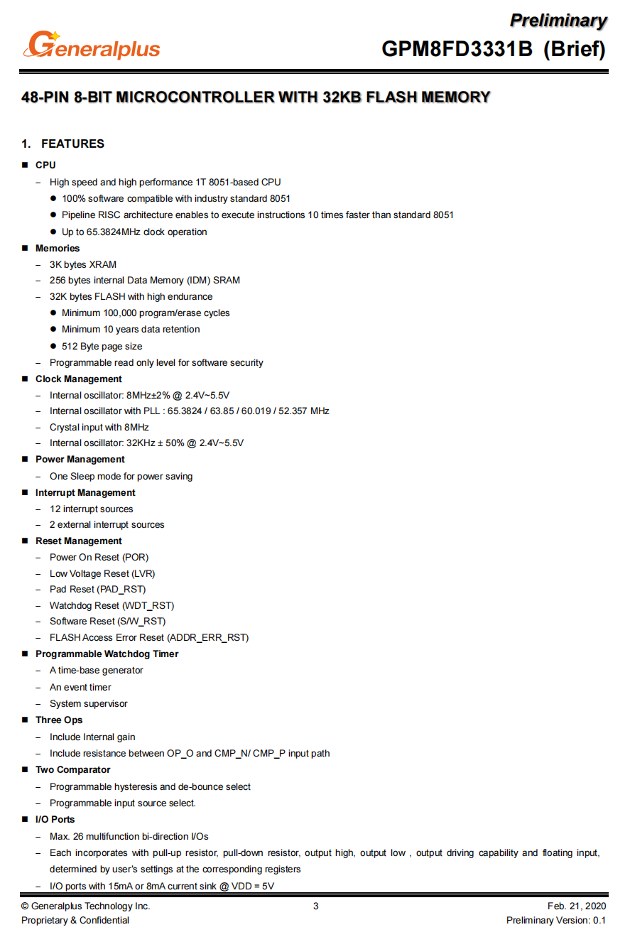 时钟管理方面,GPM8FD3331B内置了多种时钟源,包括内部振荡器、带PLL的内部振荡器和8MHz的晶体输入。此外,它还提供了省电的睡眠模式,有效地进行节能管理。