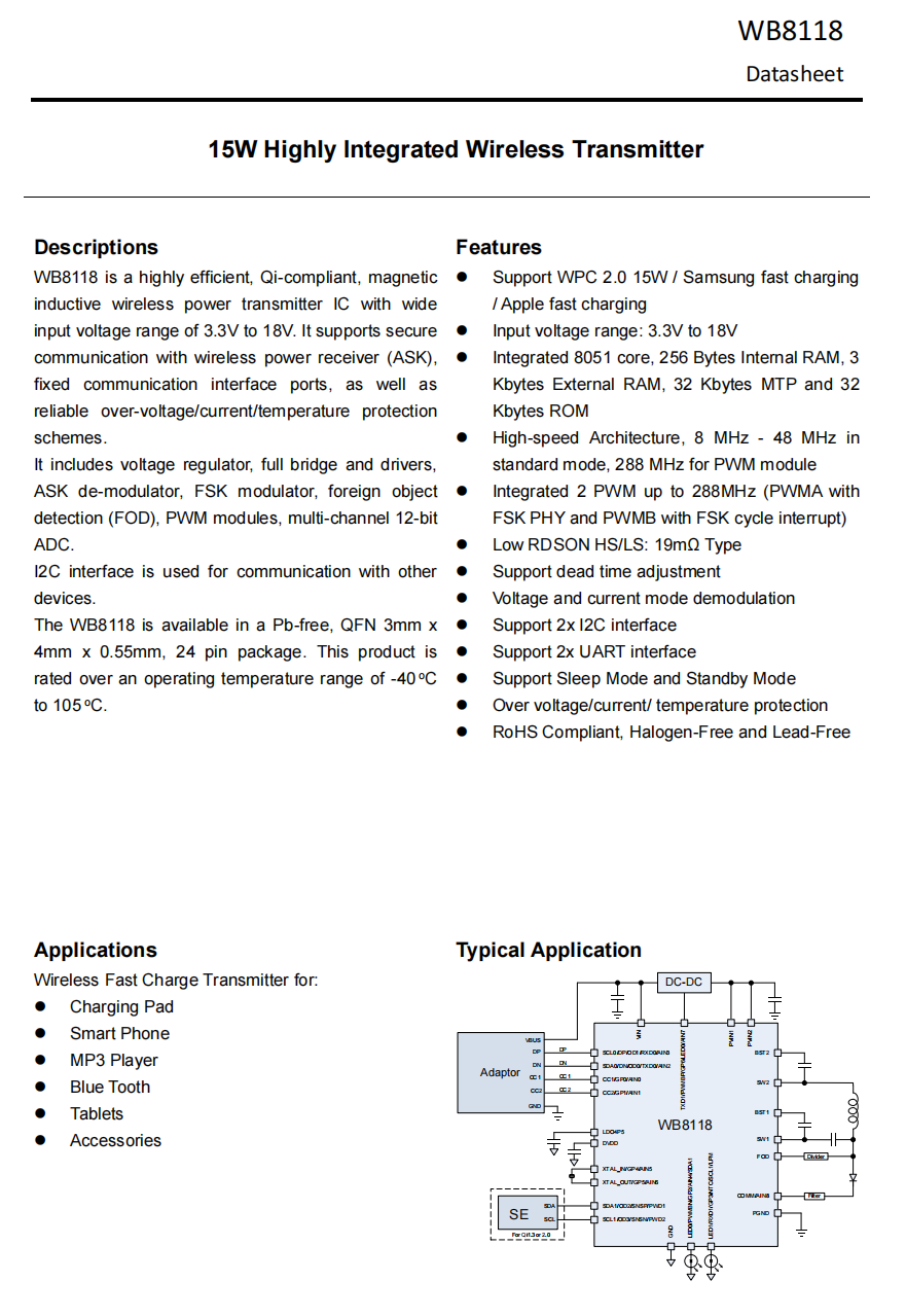 采用I²C接口与其他设备进行通信。WB8118采用无铅环保设计,封装为,24pitch。