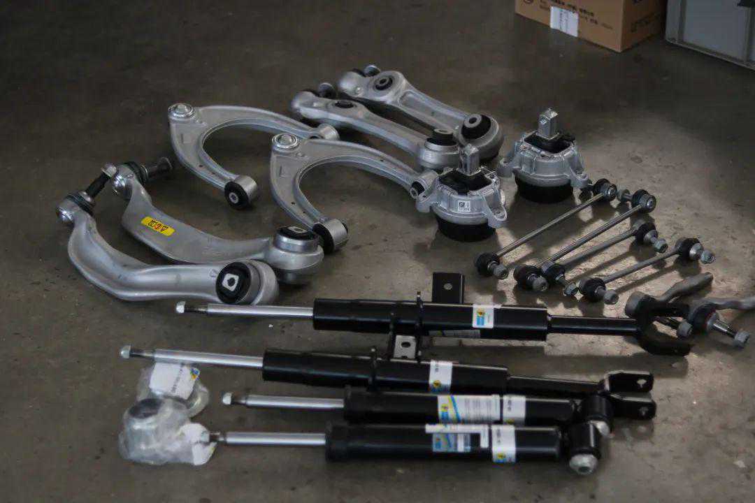 底盘系统更新,前双叉臂独立悬挂+后多连杆空气悬架结构,豪车专属配置,车主要求一步到位,所以咱们更换了全新的原厂上下摆臂+一组拉杆+方向机外球头,并升级一套德国Bilstein(倍适登)避震+原厂后气包,以达到恢复最佳舒适感及操控性。