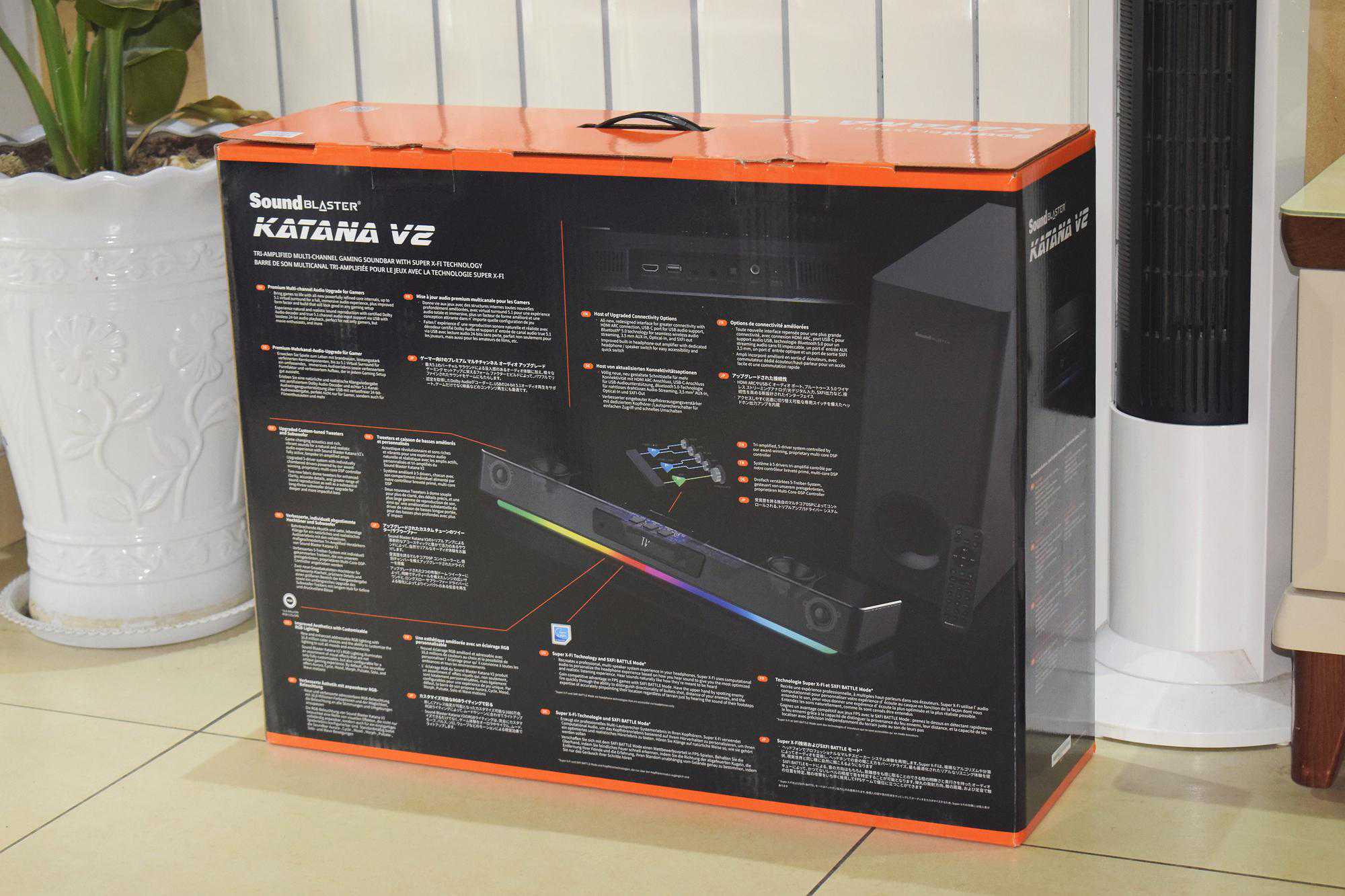 2017年,创新(Creative)将影院级环绕音效带进首款旗舰级条形游戏音箱Katana中,作为SoundBlasterX系列的拳头产品,其采用了三功放驱动五单元设计,并加入喜闻乐见的炫彩RGB灯效。让玩家能够更好的投入到游戏中去,身临其境,沉浸感十足。时隔多年,全新升级的KatanaV2带着时尚的面貌、强劲的性能以及SuperX-Fi(声晰飞)的加持久违登场。本人也在第一时间尝鲜拿到了二代Katana,下面就让我们一起来看下这款继任者有着怎样的提升与实力吧: