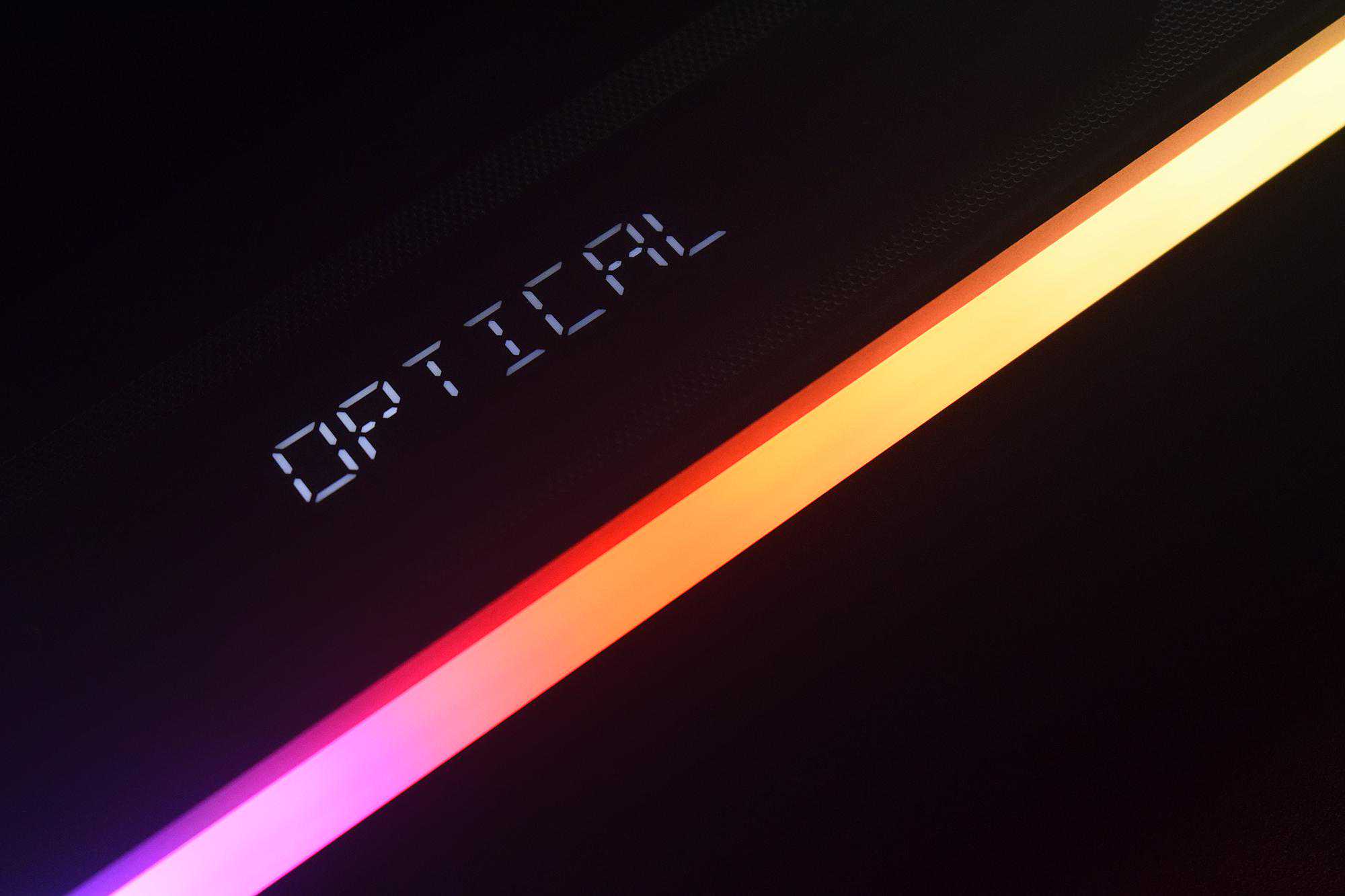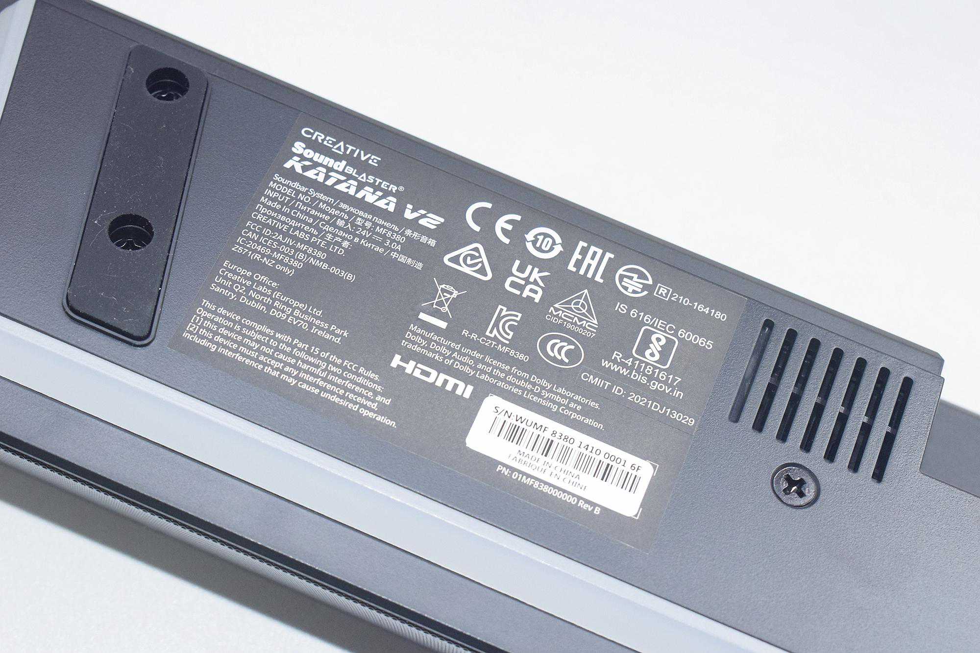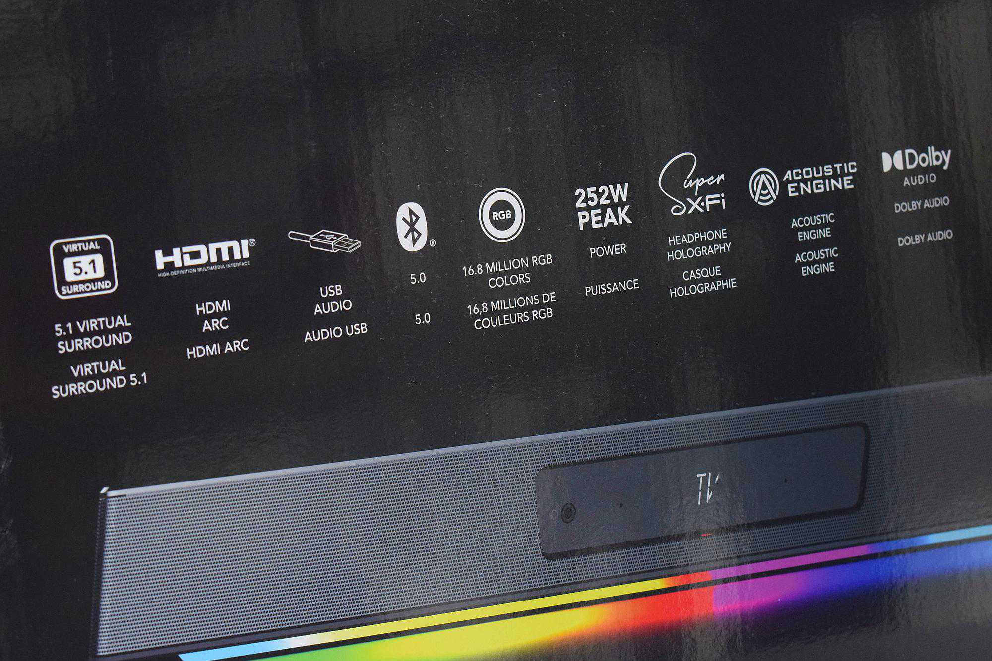 我们来仔细看一下此次KatanaV2的主打特色吧:虚拟5.1声道环绕音、HDMIARC接口(即音频回传通道,可连接电视实现声音回传)、USB音频、蓝牙5.0(一代为4.2版本)、RGB灯效、252W峰值功率、ACOUSTICENGINE(音效软件配置)、声晰飞(SuperX-Fi)和杜比音效。