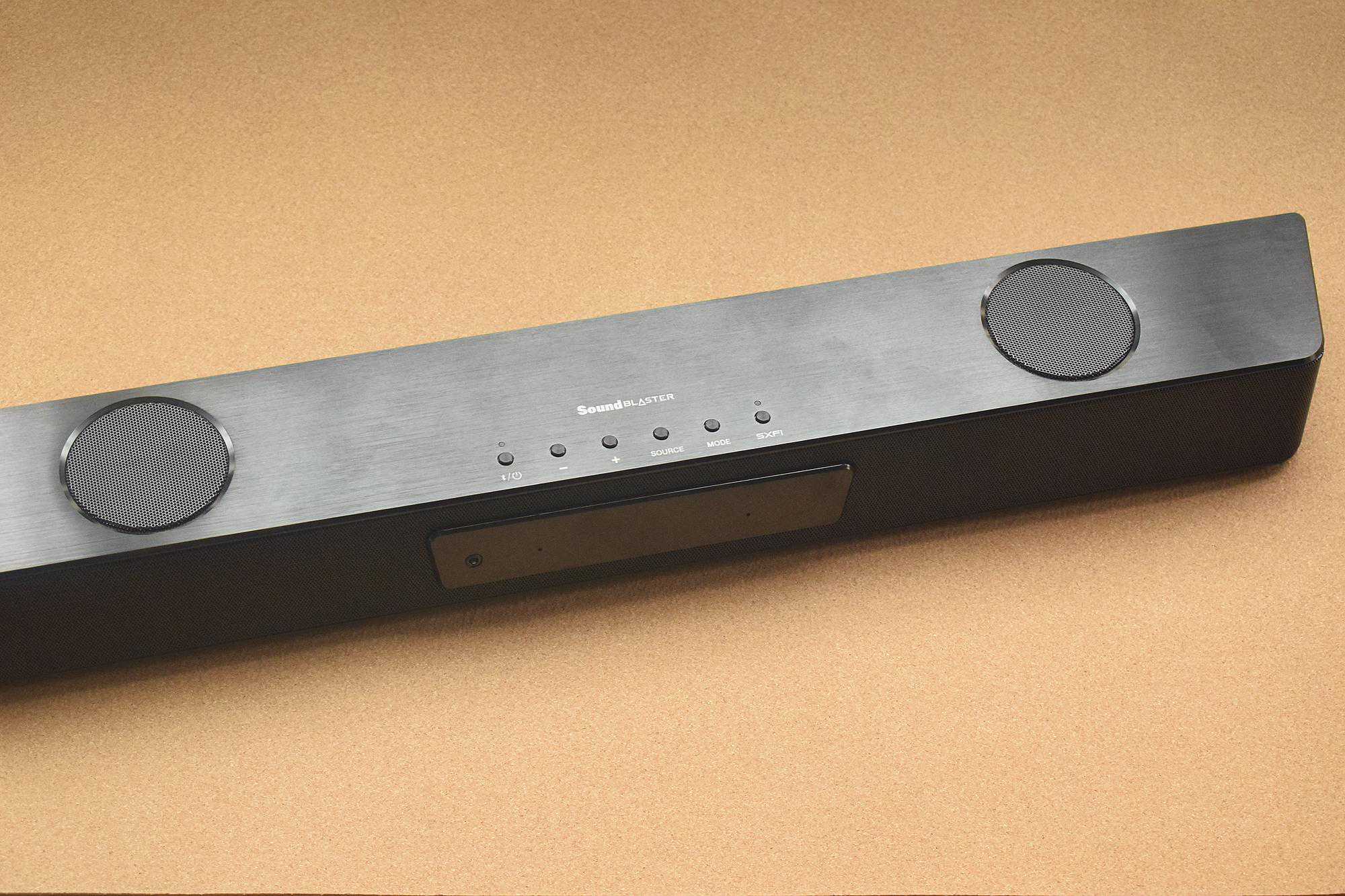 机身正中一字排开共有六枚金属按键,它们依次是开机(上有一圈状态指示灯,可长按蓝牙配对)、音量+/.-、输入模式切换(USB/蓝牙/电脑/光纤/AUX音频)、音效模式切换和SXFI。