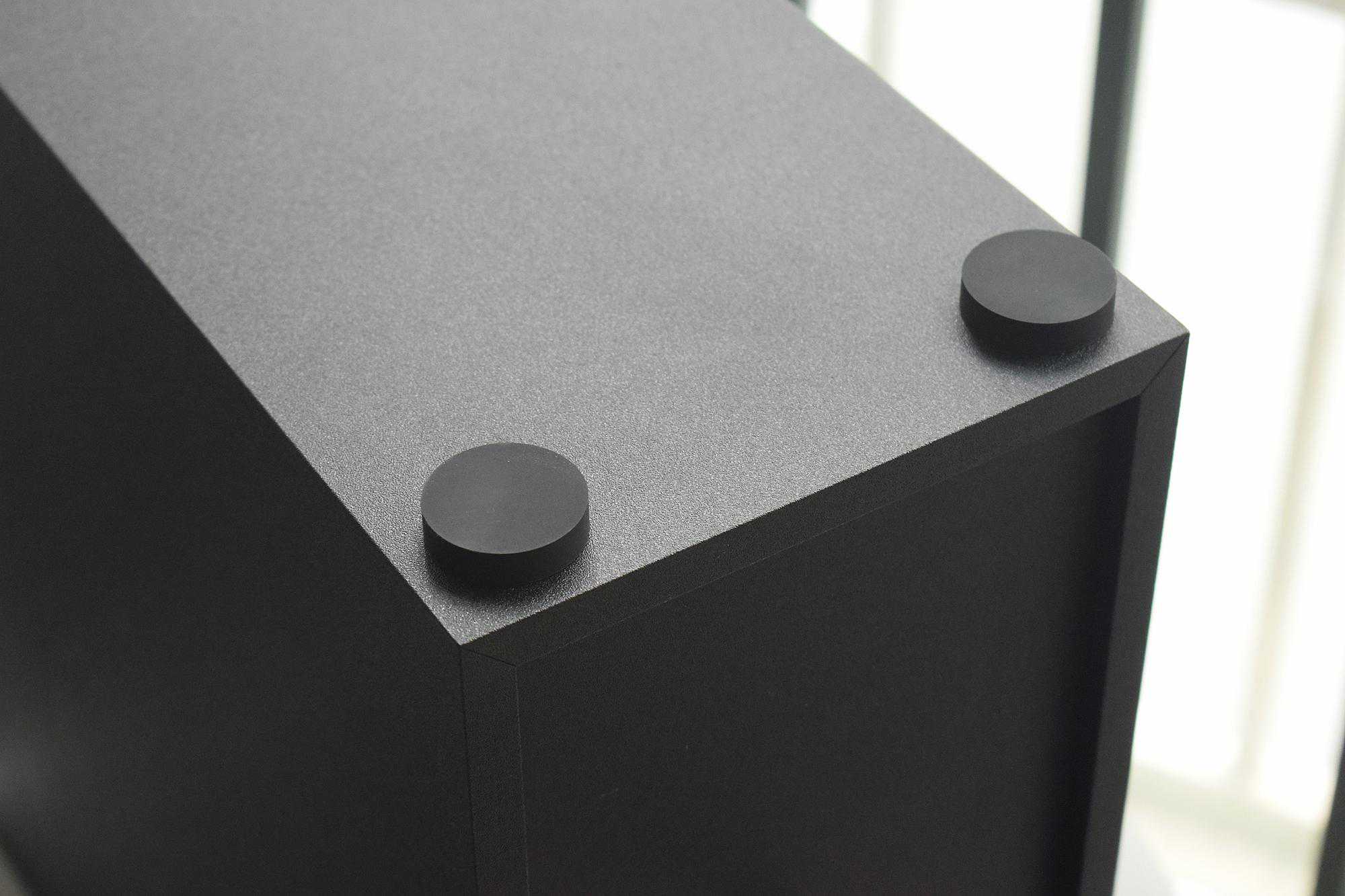 在低音炮的底盘处各有四枚防滑脚垫,以保证在桌面上的稳固度,工作共振时也有很好的减震效果。