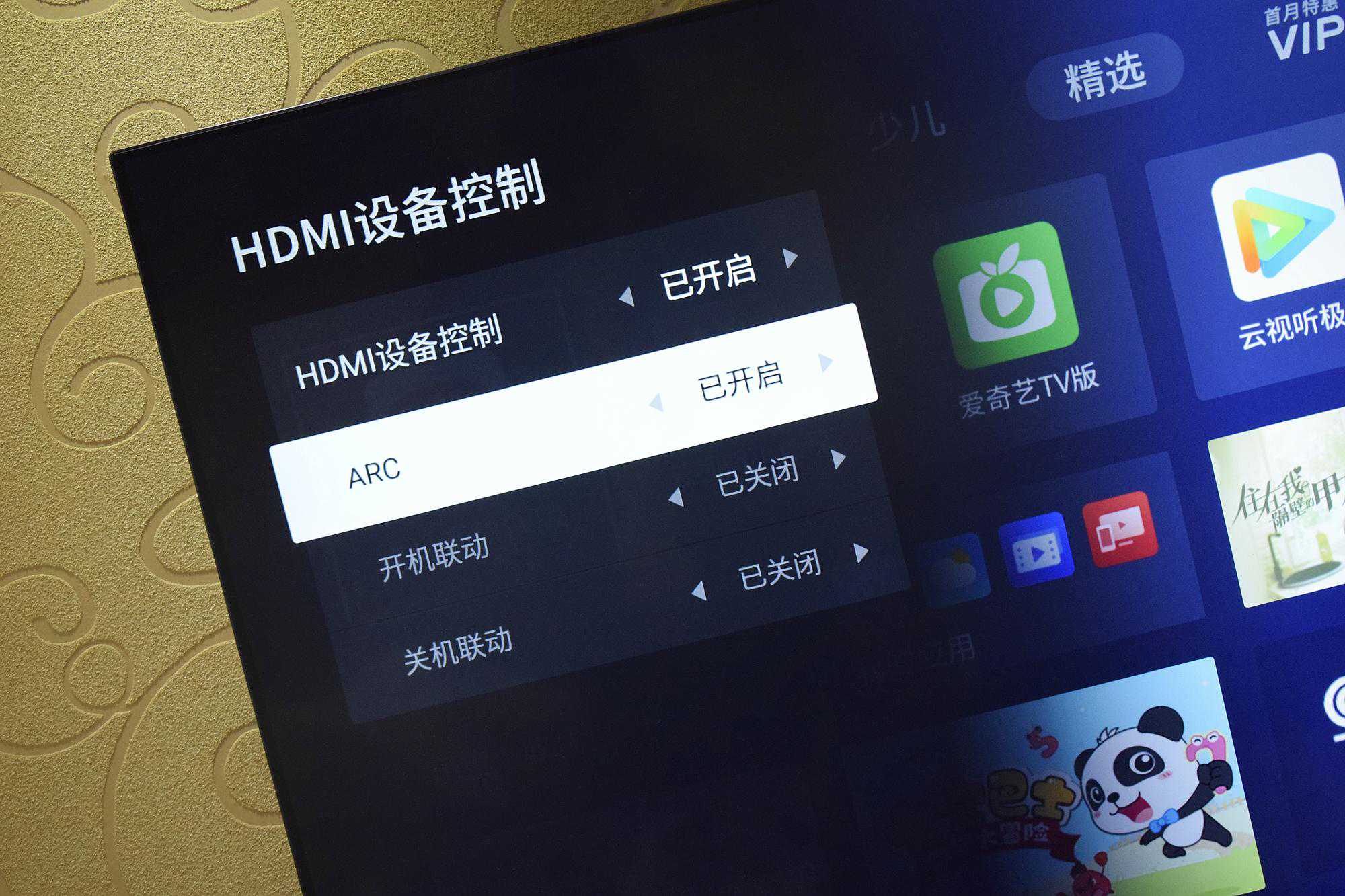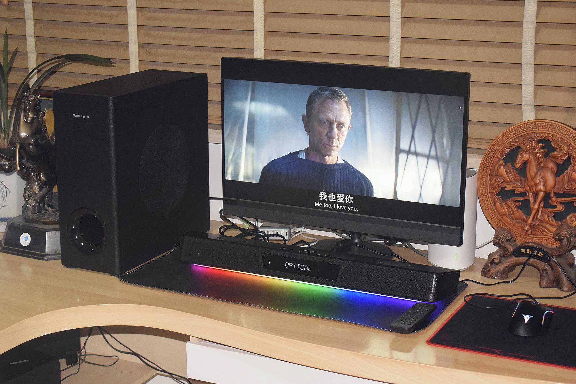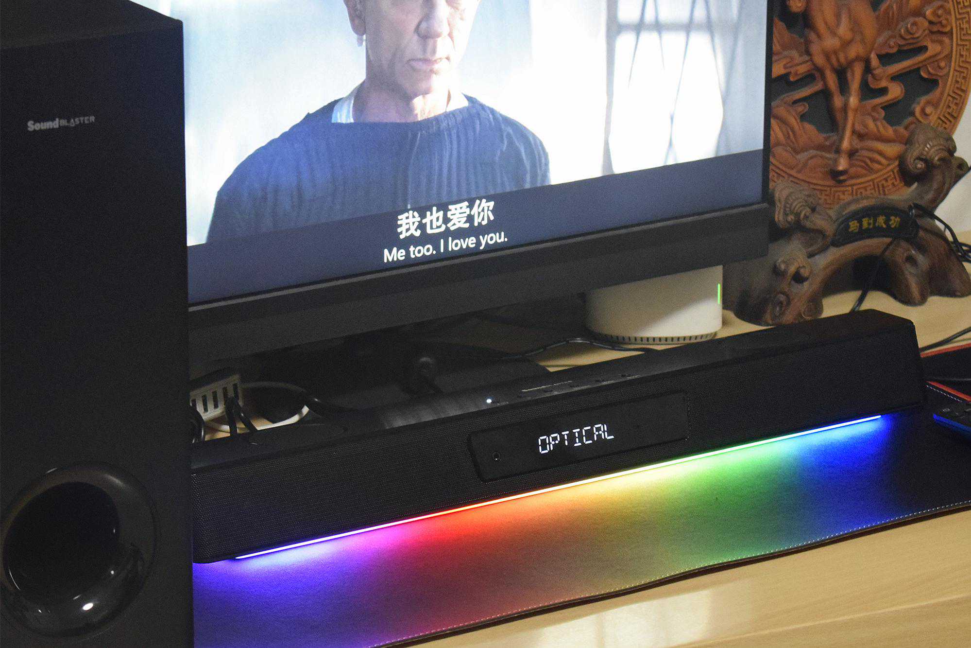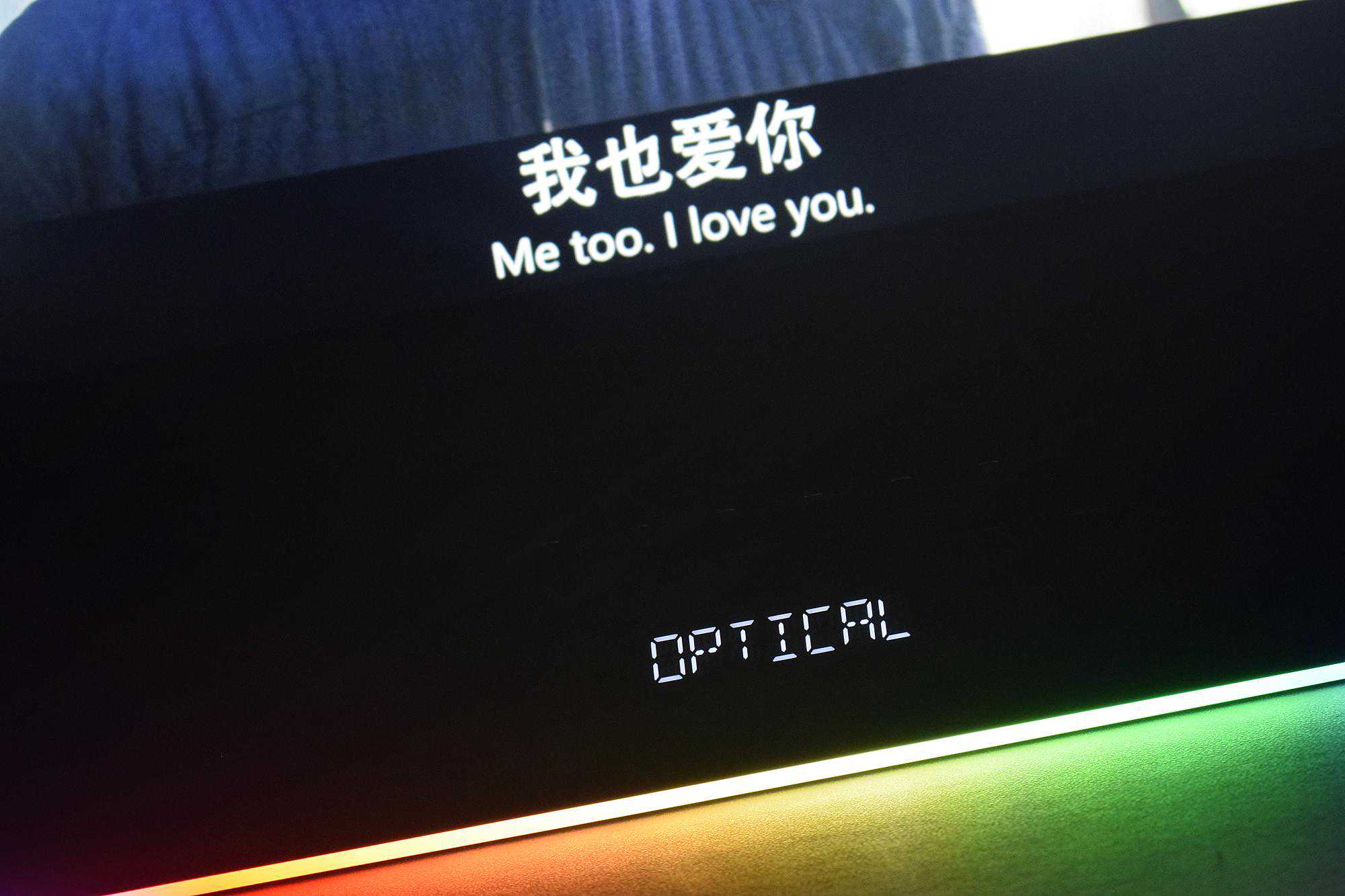 放张回音壁+低音炮的组合照吧:RGB光效很漂亮,预设组除多彩极光外,还提供了多种灯效可供选择,当然夜晚观影时如不想被灯光所打扰可以直接关掉。