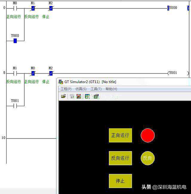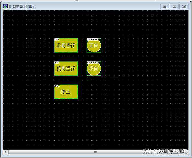 在GTDesigner2上做好你需要的界面。我们根据PLC程序分别做三个按钮:正向运行、反向运行和停止。做两个输出指示灯:Y0和Y1。如下图所示: