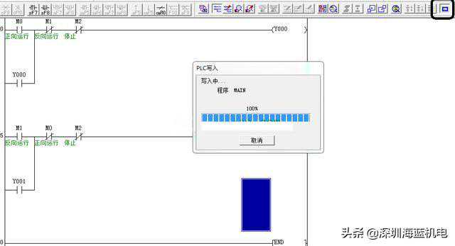 在GXDeveloper上编好程序。我们就写一个最简单的互锁启保停程序,M0是正向运行按钮信号,M1是反向运行按钮信号,M2是停止按钮信号,Y0是正向运行输出,Y1是反向运行输出。如下图所示: