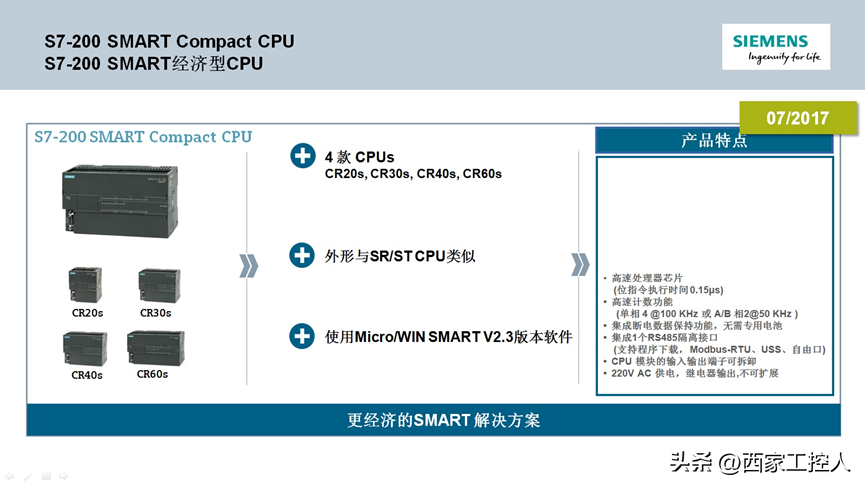S7-200SMART作为西门子的一款高性价比PLC产品,很多工控电气工程师在应用过程中对于各型号的性能和功能的差别可能不是非常清楚,本文从选型、版本功能、技术参数、扩展模块产品订货号等方面详细介绍S7-200SMART产品。