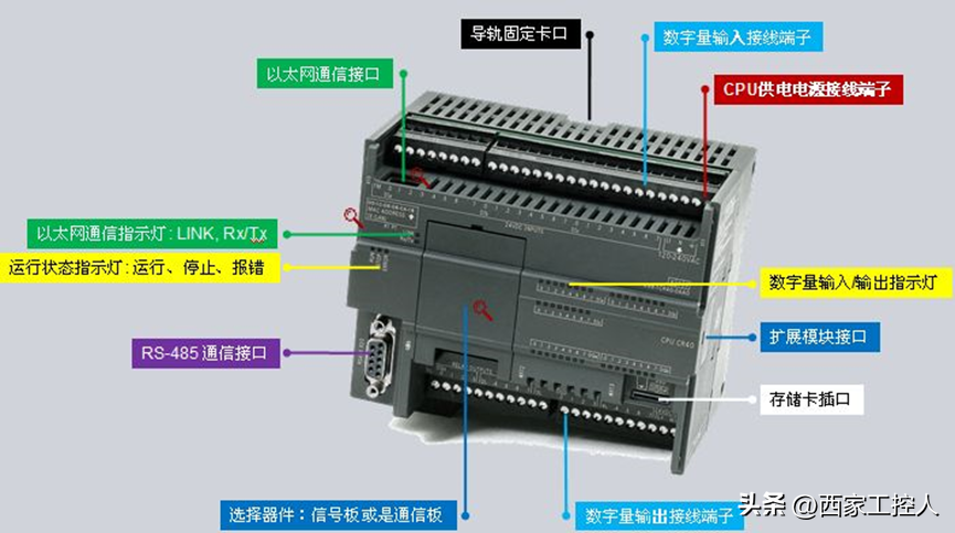 CPU还提供了24V传感器电源,该电源可以为输入点、扩展模块上的继电器线圈电源或其他需求提供24V电源。必须手动将不同电源的公共端(M)连接在一起。