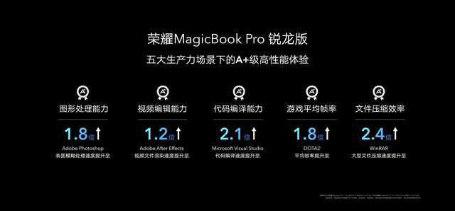 对比上一代,全新荣耀MagicBookPro锐龙版在设计场景中,AdobePhotoshop的表面模糊处理速度提升至1.8倍;在办公场景下,压缩超大文件的速率提升至2.4倍;在娱乐场景中,DOTA2的的平均帧率提升至1.8倍,带来全方位的性能升级;并加强了热管和导热底板的厚度,使得散热性能大幅提升,有效降低笔记本掌托区域的温度,即使高能释放时也能带来更凉爽的体验。