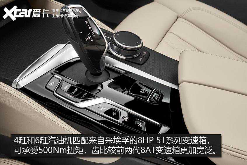 与4缸和6缸汽油发动机匹配的是代号8HP51的采埃孚第三代纵置8AT变速箱。相比前作8HP50,8HP51拥有更宽泛的齿比范围,1、2、3挡齿比均有所增加,旨在提升初段加速能力。虽然现款5系标轴版和6系GT已换装8HP51,但5系长轴距版仍采用8HP50,大概率会在中期改款时更新变速箱。