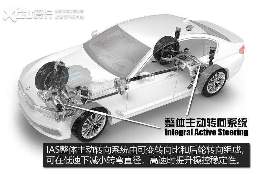 新车还可选装由可变转向比和后轮转向组成的整体主动转向系统(IntegralActiveSteering)。转向系统在中心位置拥有最大的转向比,随着方向盘角度增大,转向比变得越来越紧凑。后轮转向系统最多允许后轮旋转3度:在极低速(低于3km/h)行驶时,后轮沿前轮反方向转动,在狭窄空间内泊车时可有效减小转弯直径;而在中高速工况下,后轮与前轮保持同向转动,提升车尾的随动性。遗憾的是,国内在售的5系标轴/长轴版和6系GT均未配备IAS系统,预计新款车型依旧不会引入这项配置。