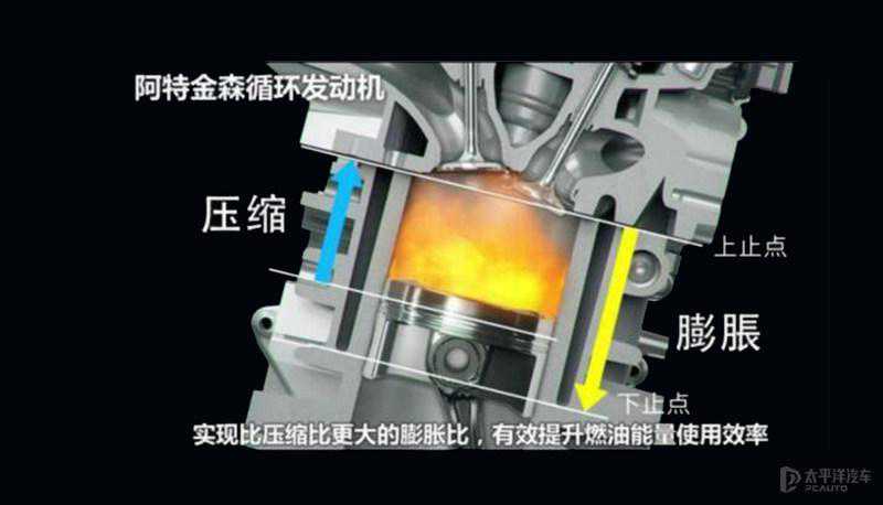 阿特金森循环的重点在于采用进气门晚关的方式实现“膨胀比大于压缩比”,让活塞的做工行程长于压缩行程,能效更高。