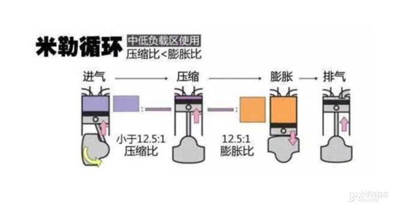 这台加装了增压装置的1.5T采用米勒循环(MillerCycle),依然实现了“膨胀比大于压缩比”,不过实现方式不同,米勒在进气行程结束之前一点点关掉了进气门,如此一来可以在低负荷区间省更多燃料。