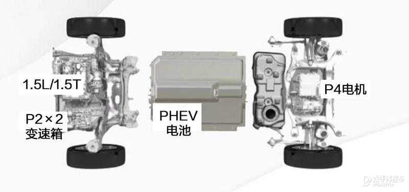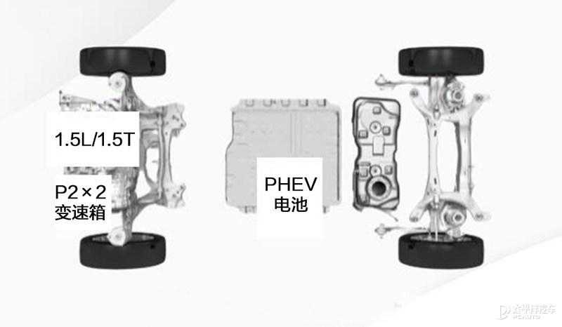 下面这张俯视图就是PHEV前驱车型,将后桥上的HEV改成底盘中央的PHEV。
