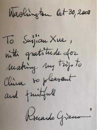短暂而密切的接触,感觉出他作为一个伟大成熟学者的可爱一面,谦逊、亲和并不乏幽默。那天人民大会堂演讲之后,美国坦普敦基金会组织嘉宾游览故宫,结果把包括CharlesTowns(93岁高龄的诺奖科学家)和Riccardo几位走得慢的老先生给搞丢了,老先生们为了按时赶赴北大许智宏校长的宴请,说是仅用半个小时径直从故宫的南门走到北门,冲上马路中央,拦了一辆出租车,终于得以体面赴宴。事后我被告知这段轶事的时候,真是为两位大腕的谦恭风范无比折服。