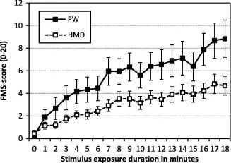 PW指屏幕,HMD指头戴式设备,可以看到随着使用时间都会越来越不舒服,但是头戴式设备会稍好一些|图源:KeshavarzB,
