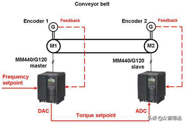 一个简单的示例如传送带上有两台变频器:一台为主传动,一台为从传动控制。
