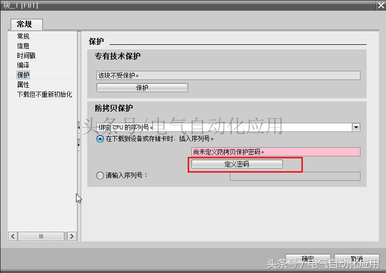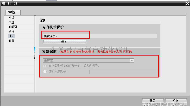 所谓复制保护就是可以绑定CPU或存储卡的序列号,程序只能下载到所绑定的CPU或存储卡中。OB,FB,FC,DB均可以使用复制保护功能。