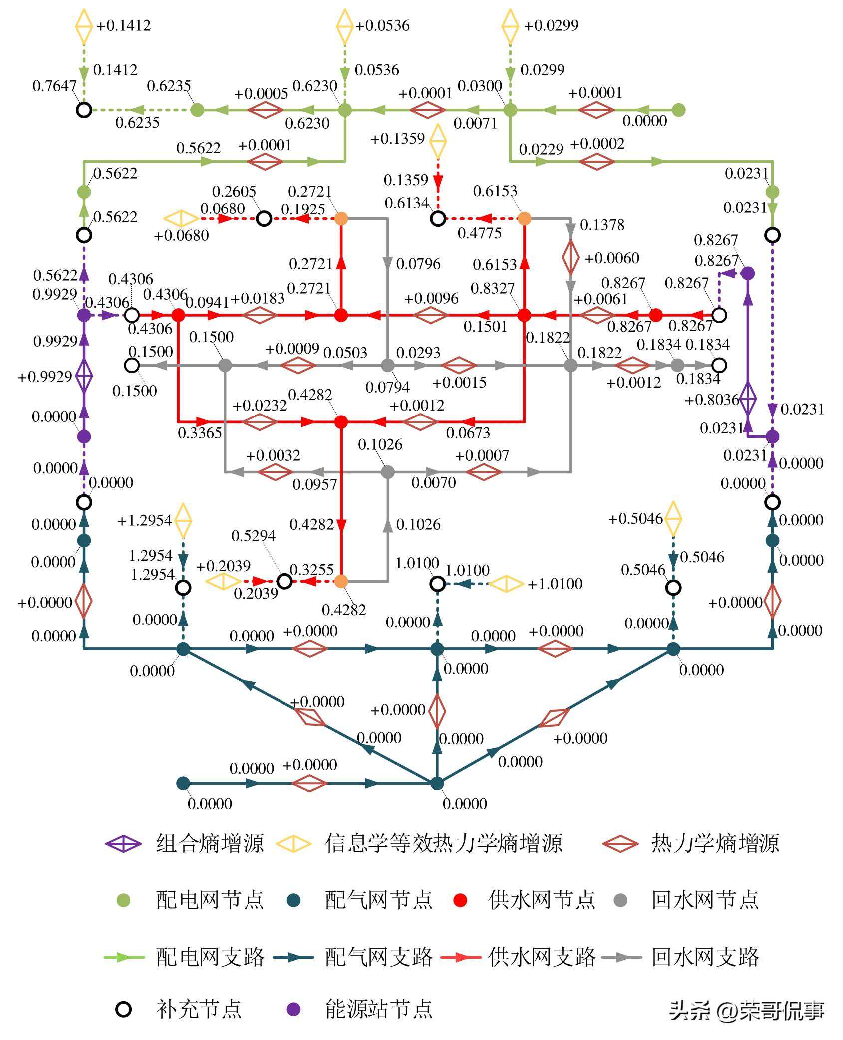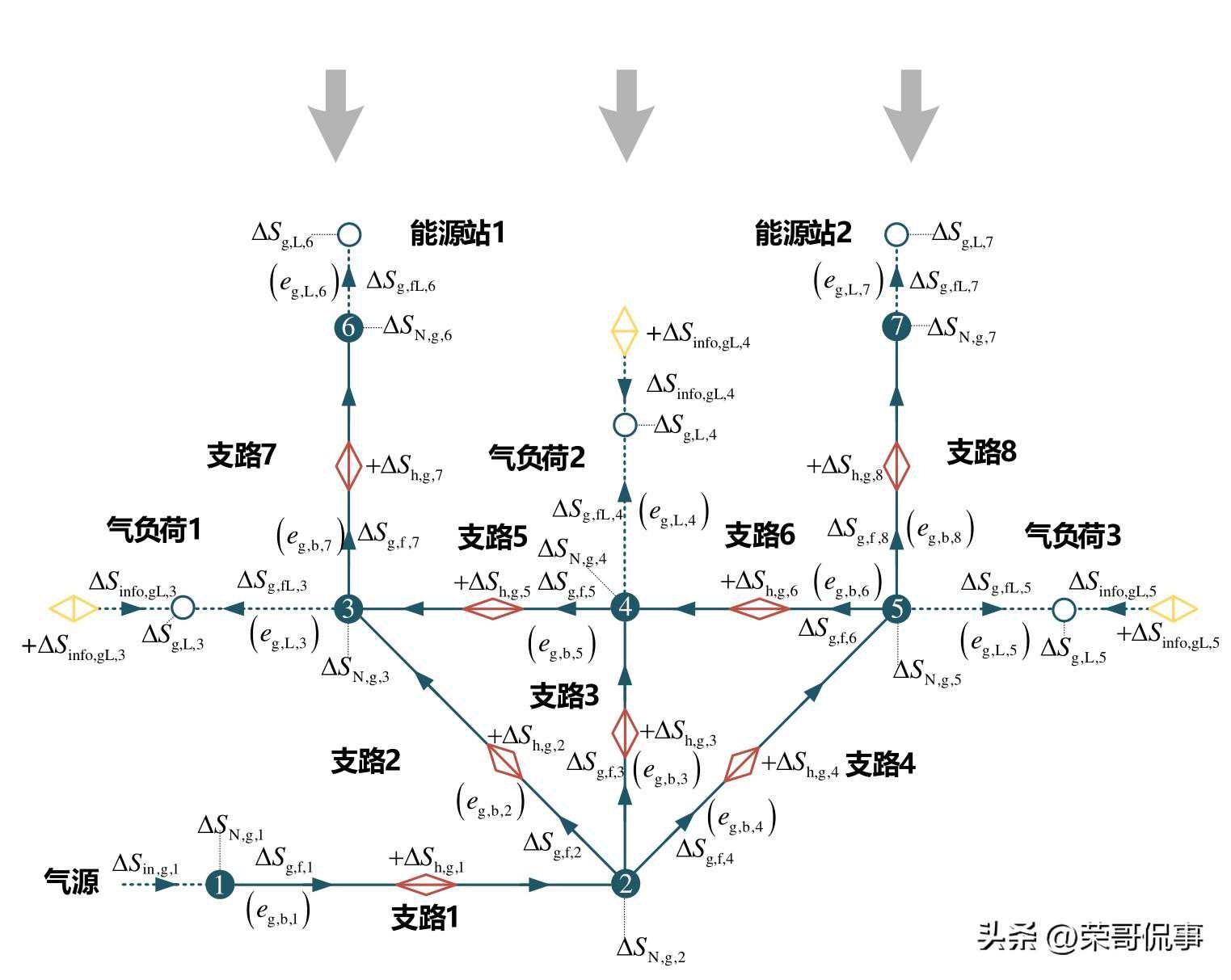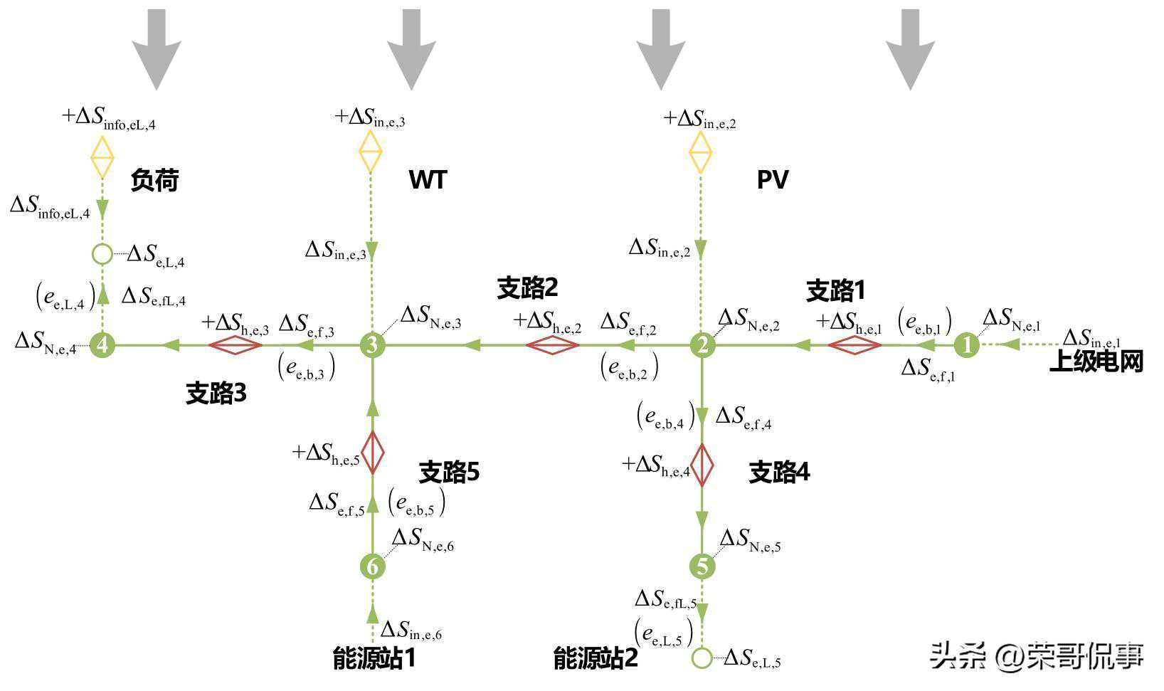 熵态计算的首要目标为计算网络熵态分布和负荷熵态分布,分别包含所有支路的支路熵增流和所有节点的节点熵增、负荷熵增,以及补充负荷节点熵增。支路熵增流为支路首端的熵增流;节点熵增为注入该节点的熵增流总和;负荷熵增为流出熵态网络并流向多能负荷或其他熵态网络的熵增流;补充负荷节点吸收负荷熵增和负荷信息熵增源注入的熵增流,表征各负荷节点对应的总熵增。