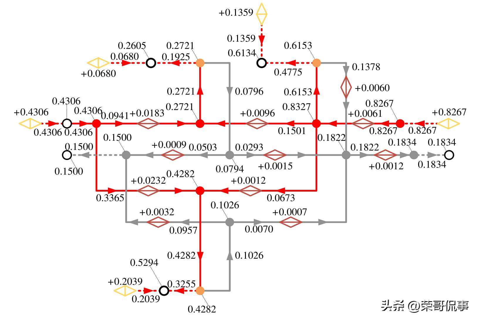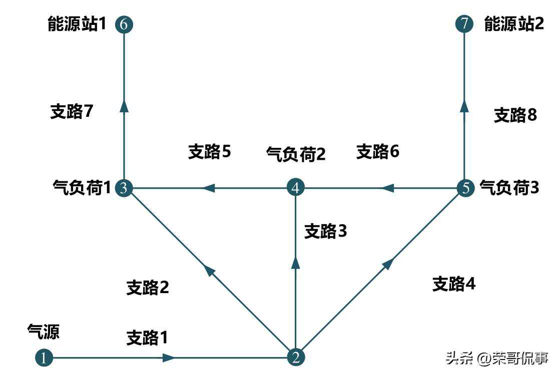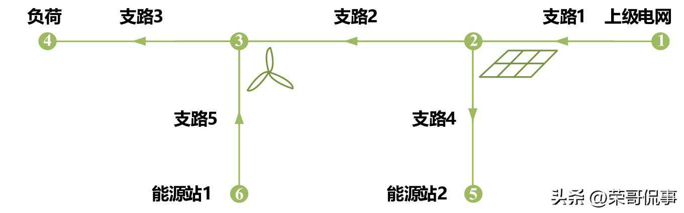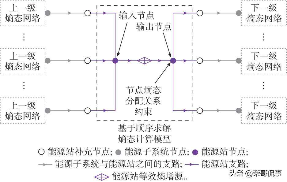 熵态计算的首要目标为计算网络熵态分布和负荷熵态分布,分别包含所有支路的支路熵增流和所有节点的节点熵增、负荷熵增,以及补充负荷节点熵增。支路熵增流为支路首端的熵增流;节点熵增为注入该节点的熵增流总和;负荷熵增为流出熵态网络并流向多能负荷或其他熵态网络的熵增流;补充负荷节点吸收负荷熵增和负荷信息熵增源注入的熵增流,表征各负荷节点对应的总熵增。