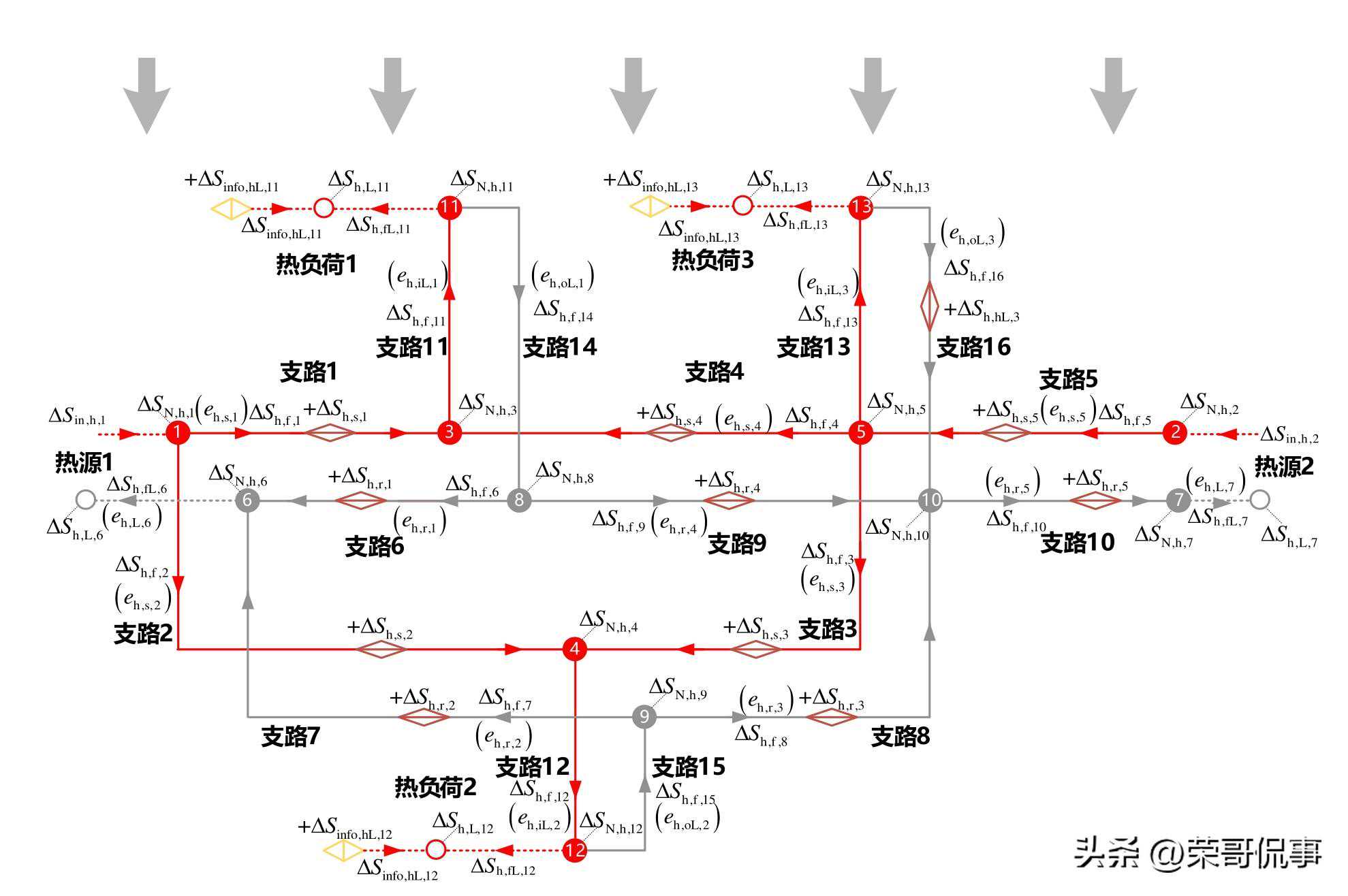 定义支路熵增流列向量为ΔSfΔ�f,维数为M,设支路j首端熵增流为ΔSf,jΔ�f,�,则ΔSfΔ�f可表示为: