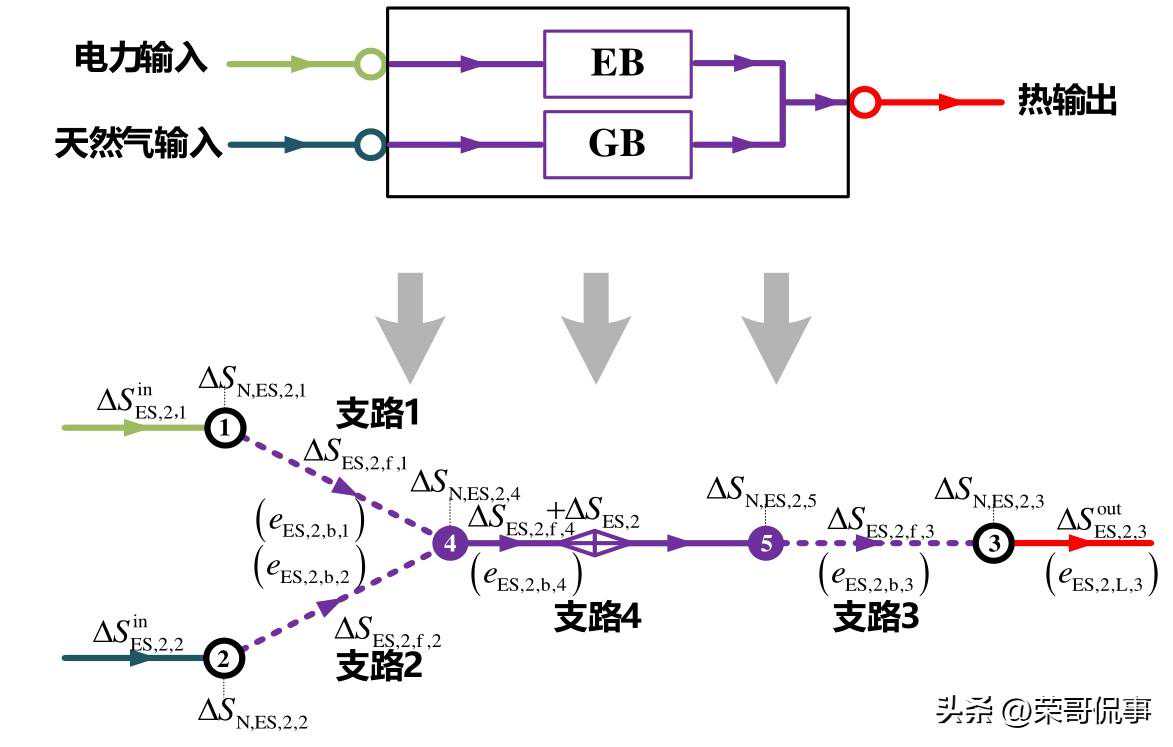 对于热力系统的某段支路,支路㶲流eb,heat�b,heat、支路㶲损ΔeheatΔ�heat可表示为: