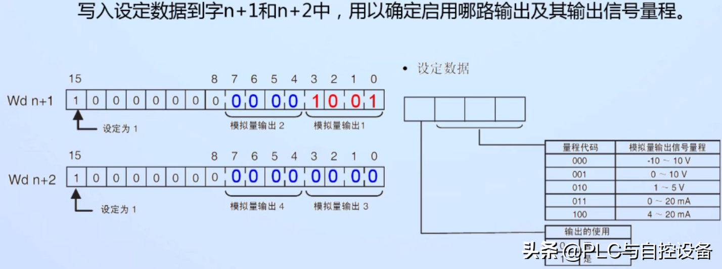 由于设定通道字与模拟量输出字有重复使用,故参数设定后要延时0.2秒,再给模拟量输出通道n+1~n+4赋值数字量。