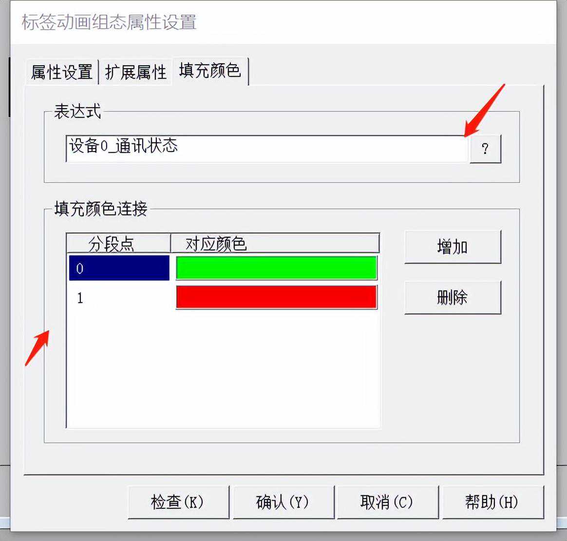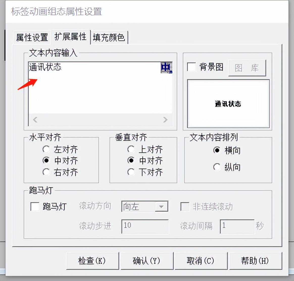 新建一个标签,输入“通讯状态”,用于显示屏幕与仪表的通讯状态。分别进行属性设置、扩展设置和填充颜色设置。