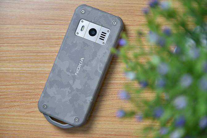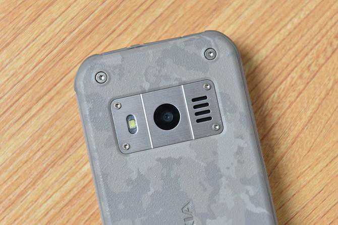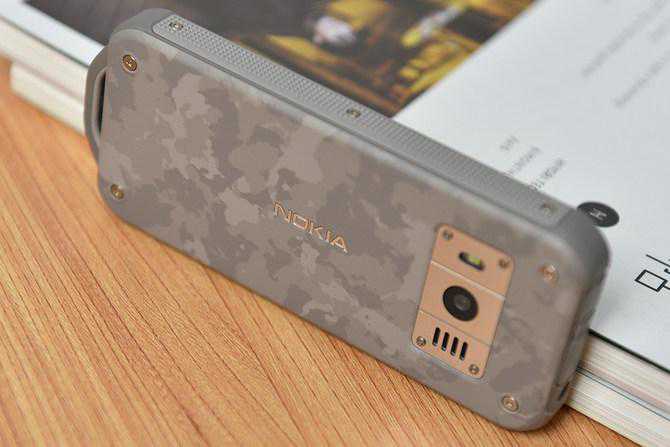 机身背面使用了类似塑胶的材质,并採用磨砂处理,增强表面的摩擦力,手感舒适,搭配上迷彩的配色,给人一种非常坚固的印象。需要注意的是,由于做了三防处理保护,Nokia800的使用了一体型机身,电池不可自行更换,而2100mAh电量比一般功能手机多一倍,续航时间更是提供到了长达45天。