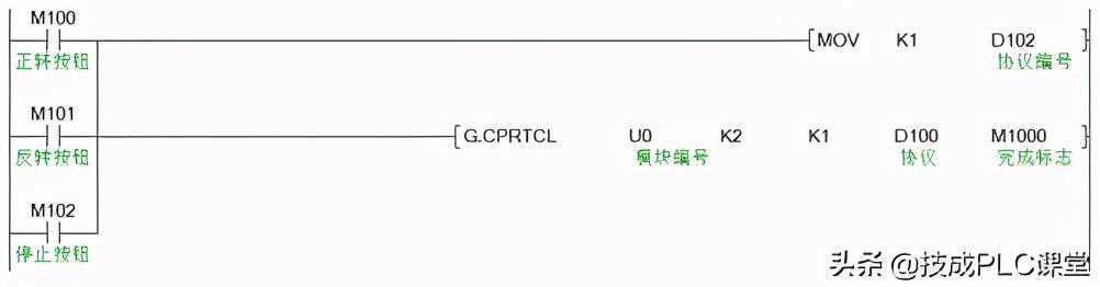把正反转以及停止的辅助继电器并起来,一起启动通讯指令。模块编号为0,启动第2通道,只执行1条协议,协议编号为01,M1000为完成标志位(指令含义看前置基础(1)).