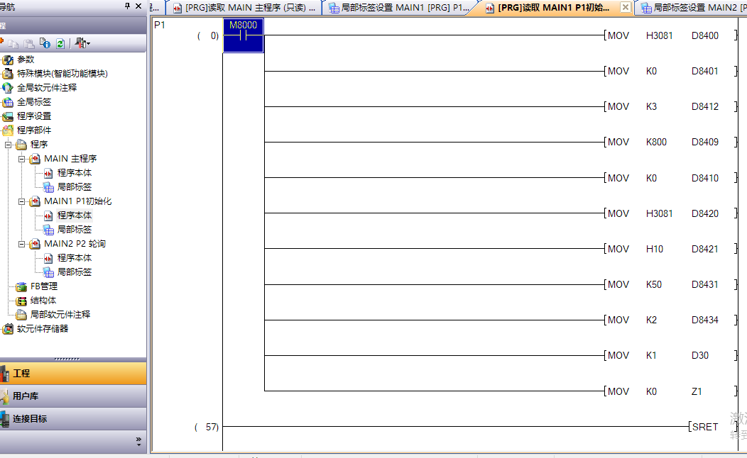 在一个工厂项目中我们有这样一个案例,有一个威纶通的触摸屏连接三菱PLC(国产)来读取八台气体流量计(主要是氩气),氩气主要用于机器人的焊接工件的保护焊接,三菱FX3U(可以使用ADPRW指令),PLC本体有两个485通讯口和一个232通讯口,两个485通讯口,分别做主站和从站,主站用于轮询采集八台气体质量流量计,现在把轮询的程序贴图出来,我们这里做的是时间轮询,经过实际测试,我们在读取八台流量计的时间在600毫秒左右,程序如下,如果哪位朋友要原程序的可以给我留言或私信我,程序没有做注释,是分成主程序和子程序来调用的,P1是MODBUS主站和从站的初始化设置,P2是八台流量表定时轮询读取的是分别标的是流量总量(32位无符号)和流量瞬时流量(浮点数)。