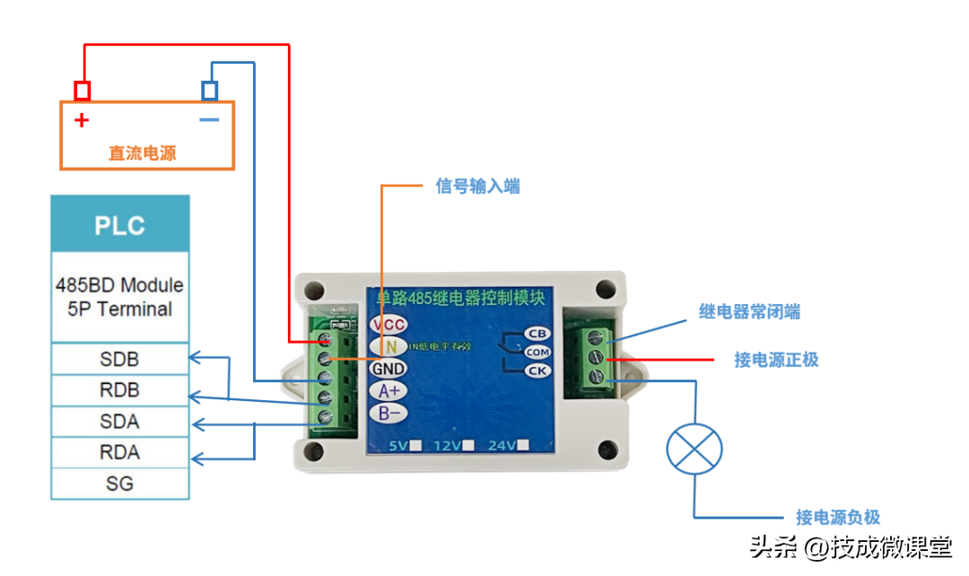 1.使用器材:FX3U-PLC(加485-BD板)、485继电器模块。