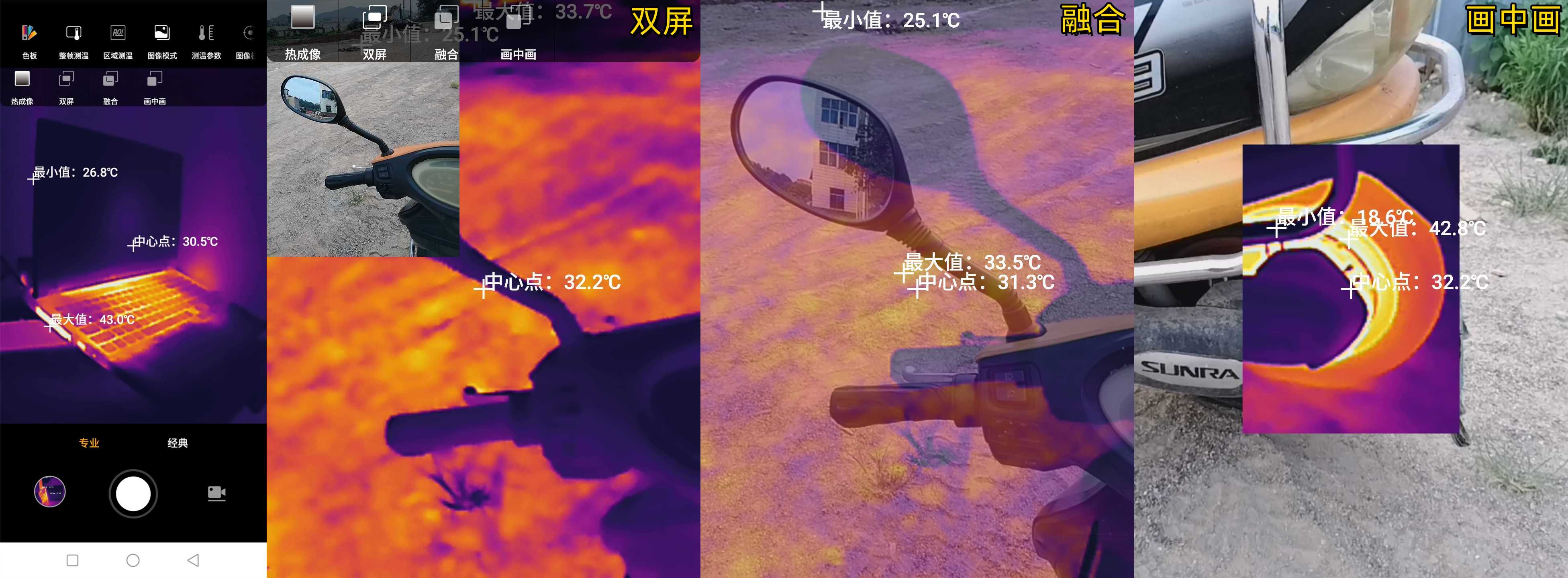 ▲AGMG1SPro的热成像功能图像模式包括热成像、双屏、融合和画中画4种,“热成像”模式很好理解,就是我们常见的热成像画面。而双屏、融合和画中画可以根据个人喜好进行选择,最终结果都是更好地理解测温区对应的位置,进行针对性处理。