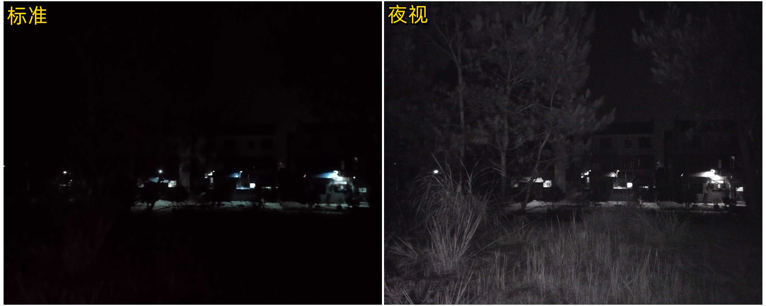 ▲对比一下在夜晚拍摄稍有亮光的民宅,标准模式下只能看到光,夜视模式下,则能看到草丛、松树和远处民宅的轮廓。