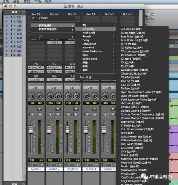 除了在音轨窗里挂插件之外,在调音台窗中也是完全一样的,如图5-4所示。调音台窗口怎么调出来呢,按“花”+“等号”就可以弹出。