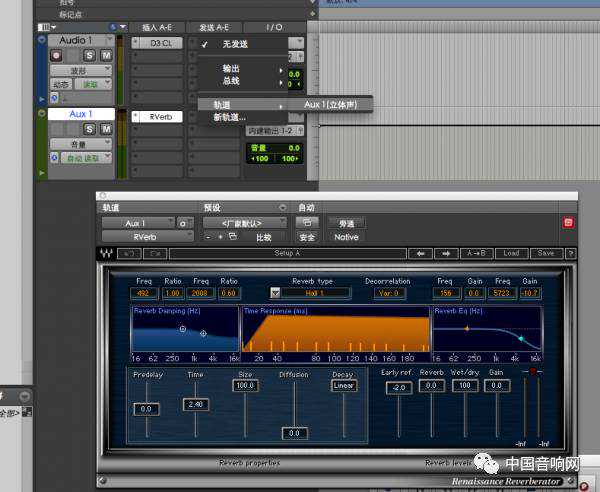 然后,在建好的Aux轨上,挂上混响。就像插入式一样的挂法。如图6-2和6-3所示。
