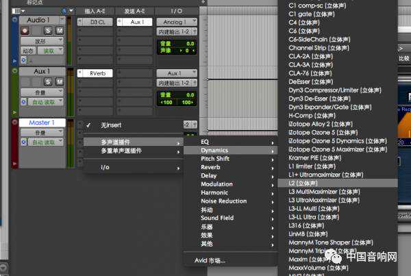 在新建音轨菜单中,选择主推子,注意要选立体声。就可以建立Master主推子,也就是全部音轨的总推子。这个推子用来控制整体的音量电平大小。另外,母带处理效果器也是挂在这里。比如常用的WavesL2就可以用在这里。如图7-1、7-2所示。