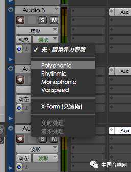 这也是很常用的功能。首先,将这条音轨左边的“弹力音频”选项选上,这条音轨才能变速。如图11-1所示,弹性算法有四种,前三种都是变速不变调,Polyphonic适合多重混合的乐器,比如钢琴、弦乐,Rhythmic适合处理节奏打击乐,Monophonic则适合单音的乐器独奏或人声。第四种弹性算法Varispeed是变速并变调的,其实这是模拟传统磁带的形式。