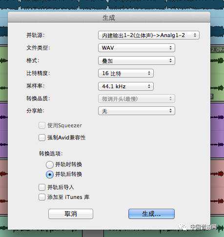 导出的格式都可以选择,如图13-3所示。如果是ProTools11以上的版本,这里会有快速离线导出的选项,选上之后可以像Cubase那样快速地导出,不用从头到尾听一遍了。但如果是10以下的版本,就只能从头到尾欣赏一遍吧。如果是录很长的东西比如整场音乐会,那就很麻烦了。所以建议大家还是用最新版,实际上,使用“蓝猫”插件也能在ProTools11以上的版本里用VST或AU的插件,但比较麻烦。如果资金允许,ProTools11以上的版本配一个UAD效果卡也是不错的搭配。